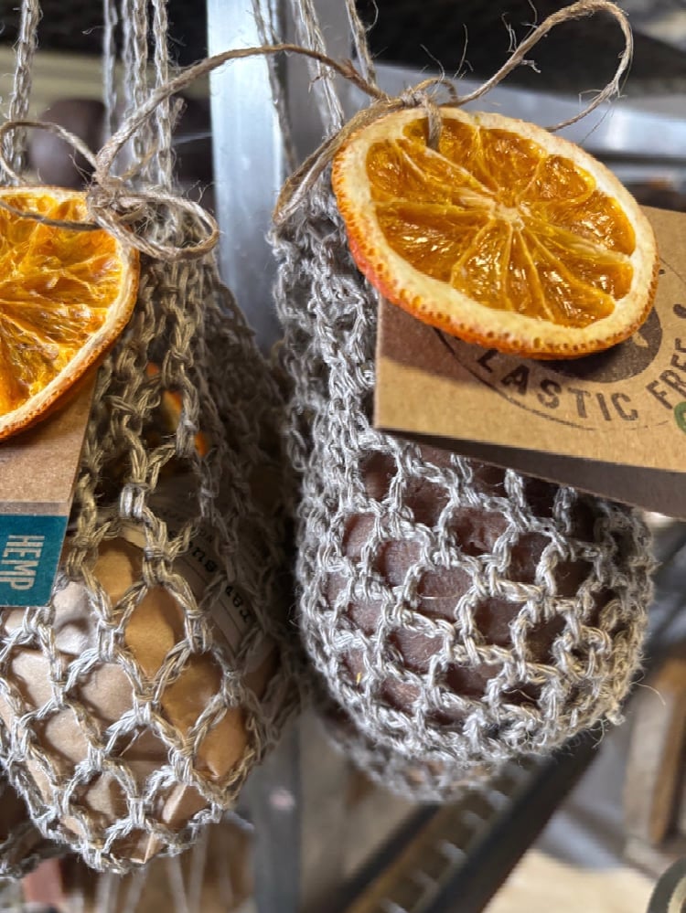 Our raw.suds Christmas Sweet Orange + Spice Soapball comes with hand knotted eco hemp soap saver